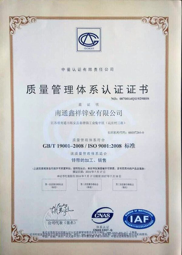 鑫祥鋅業(yè)正式取得ISO9001質(zhì)量管理體系的認(rèn)證證書。